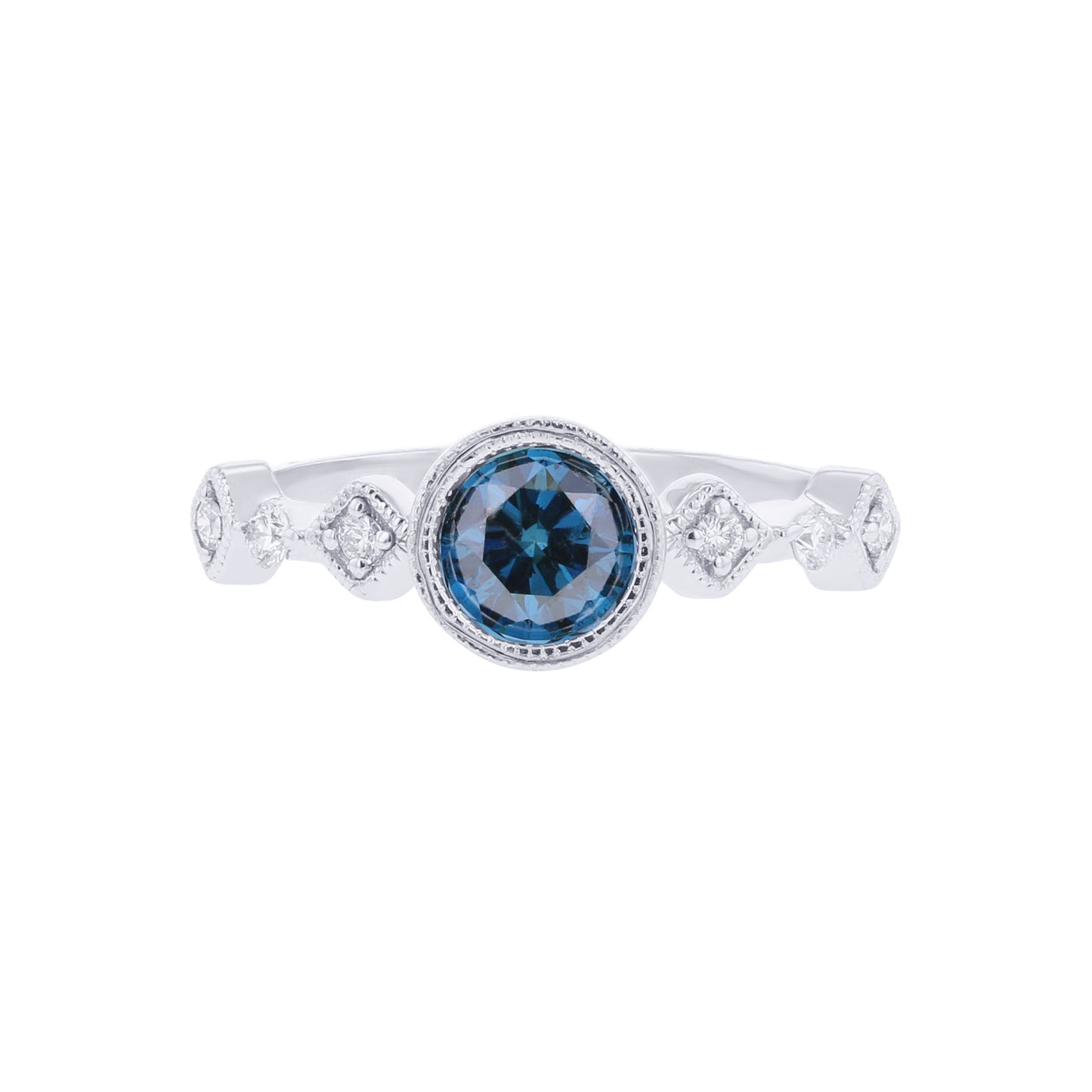 Elevate your style with this playful Ethereal Sky Blue Diamond Ring. Crafted with 14 karat white gold, it features a 3/4 carat round brilliant sky blue center diamond, bezel set for a sleek look. Milgrain detail adds a touch of whimsy to this 1 carat total weight stunner.