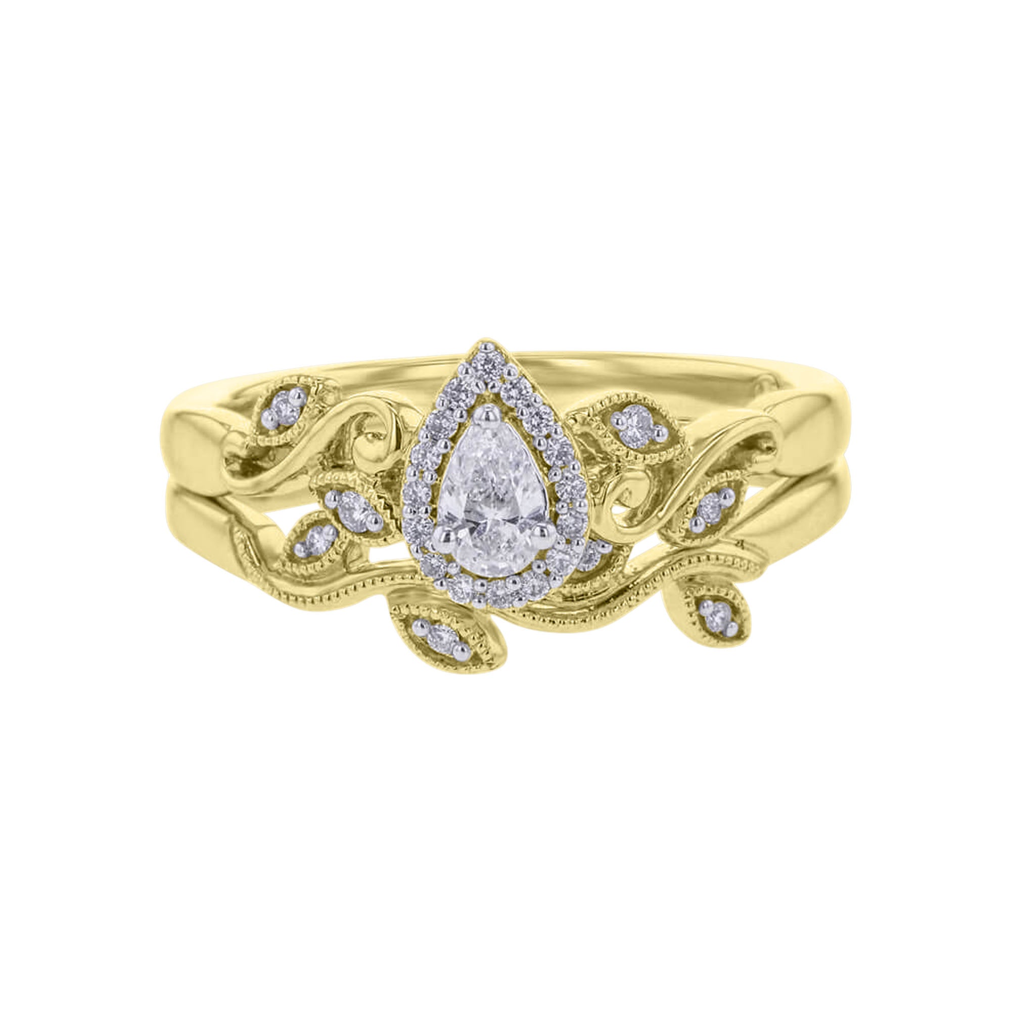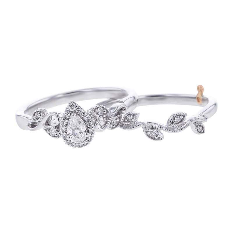 Get ready to fall in love with our Lovely Vintage Vine Bridal Set! With intricate leaf and milgrain detailing, this set exudes charm and elegance. A pear shaped diamond is surrounded by a halo of even more diamonds and set into 14k gold entwined into a wonderful ready for love bridal set. Perfect for any vintage-loving bride-to-be!